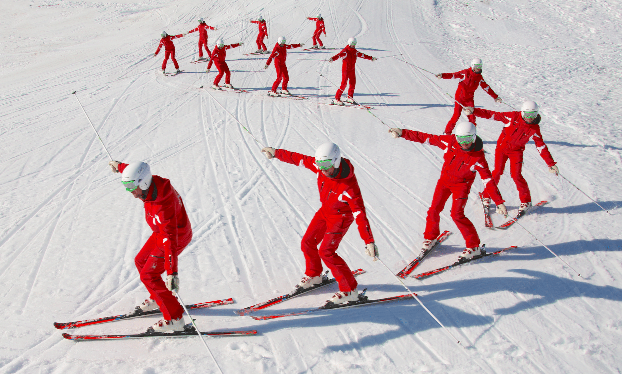 De skiër neemt beide stokken omgekeerd in zijn handen en houdt de stokken naast zijn lichaam. Terwijl de skiër begint met het sturen van de bocht beweegt hij zijn dalstok, een beetje naar achter wijzend, naar de sneeuw. Tijdens het sturen sleept de dalstok door de sneeuw achter de skiër aan. De bergstok blijft in tegenovergestelde richting naar de lucht wijzen. Op deze manier komt het bovenlichaam boven het dalbeen.